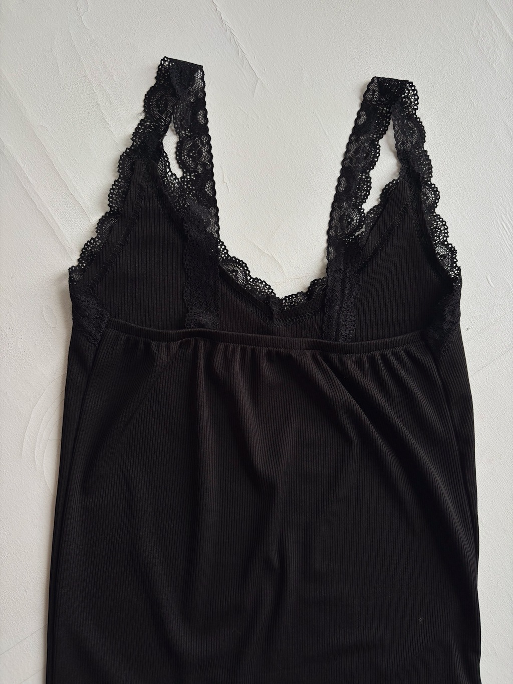 Musculosa de morley satinado escote V con breteles de puntilla. Espalda recta. Súper elastizada! Talle único. Medidas: ancho (tela relajada) 40cm estira hasta 45cm. Largo total 55cm